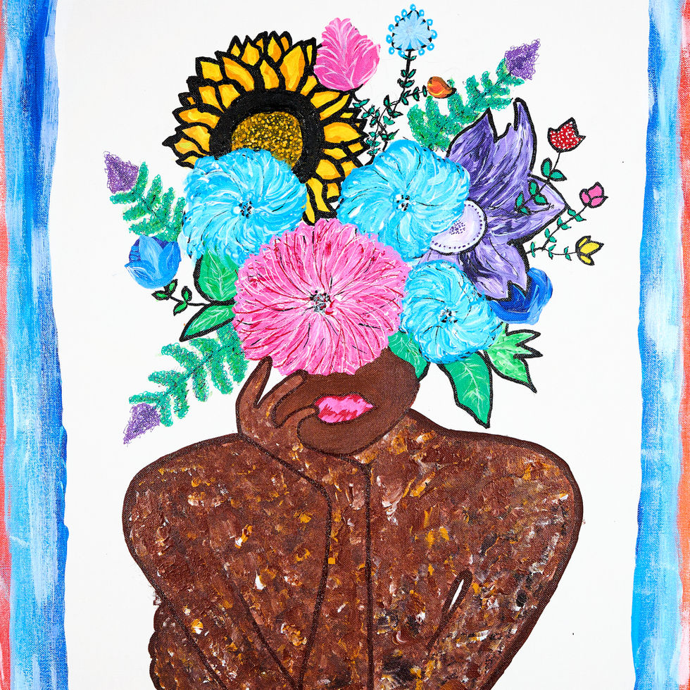 Radiant Growth is a vibrant celebration of transformation and inner strength. The faceless figure blossoms into a radiant crown of flowers — sunflowers, morning glories, and wild blooms — symbolizing resilience, beauty, and the endless cycle of renewal. Rich textures in the body contrast with the vivid florals, creating a balance of grounded strength and flourishing spirit. Perfect as a statement piece, this original invites light, positivity, and growth into any space.
