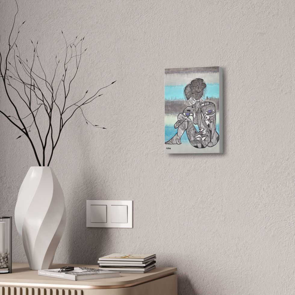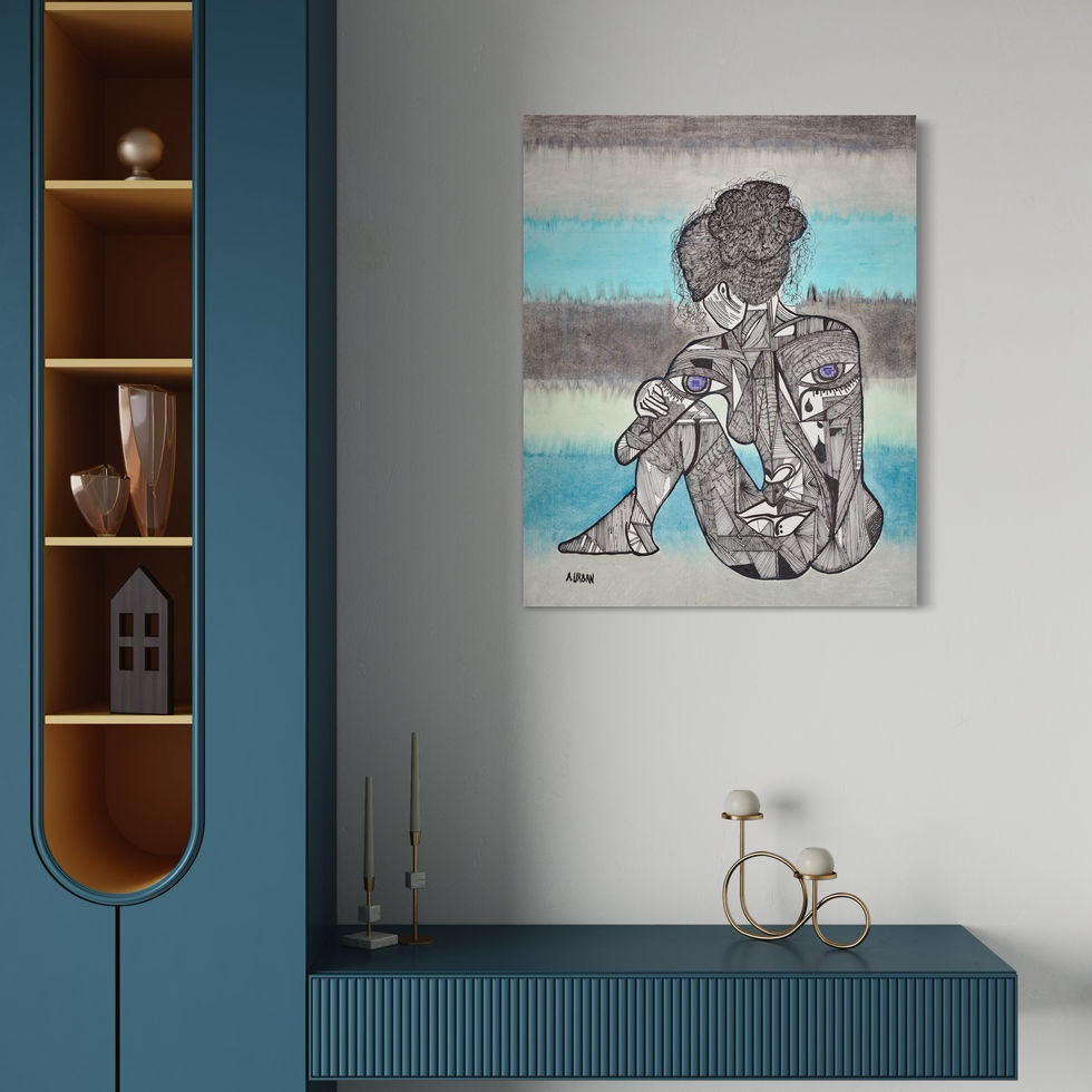 A striking mixed-media original by A. Urban, Reflections in Fragments blends intricate linework with serene gradients of blue and grey. The seated figure, formed from interwoven faces, eyes, and geometric patterns, symbolizes layered emotions and self-reflection. Violet eyes and subtle teardrops add depth and vulnerability, making this piece a captivating statement for any collection. Perfect for those drawn to art that tells a story of beauty, resilience, and complexity.